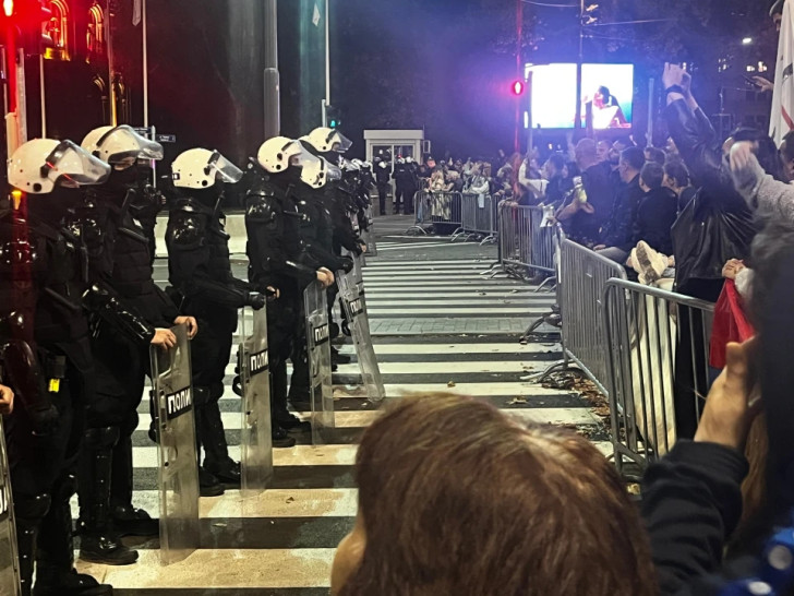 Kako je javila reporterka Insajdera, kod Skupštine, gdje se okupilo nekoliko stotina ljudi, trenutno je mirno, a ispred građana stoje policajci sa dugim cevima.