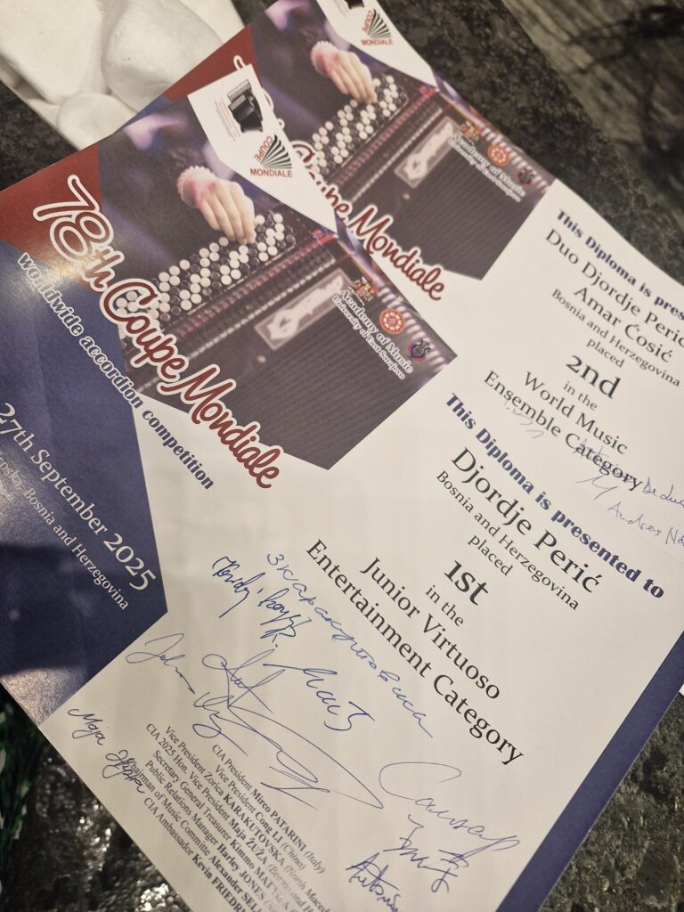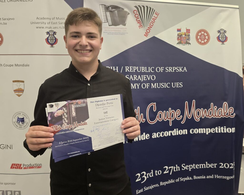 Na najprestižnijem međunarodnom takmičenju iz oblasti akademske harmonike – 78. Svjetskom kupu (Coupe Mondiale), koje je održano od 22. do 27. septembra 2025. godine u Istočnom Sarajevu, mladi umjetnik iz Bijeljine Đorđe Perić, u klasi profesora Slaviše Perića, ostvario je izuzetan uspjeh, osvojivši titulu svjetskog prvaka u kategoriji Junior Variete.