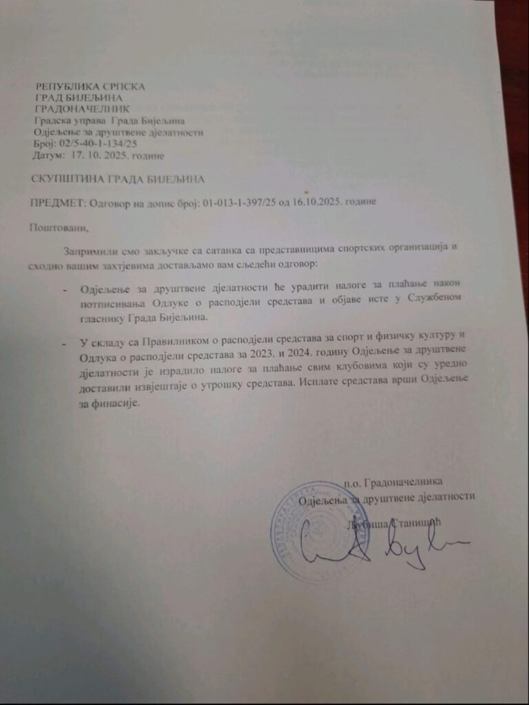 Možda jedno od najkorektnijih odjeljenja u Gradu Bijeljina, Odjeljenje za društvene djelatnosti, između ostalog reklo je da se ne mogu formirati nalozi za isplatu dok se Odluka ne potpiše. Odgovor pogledajte u nastavku.