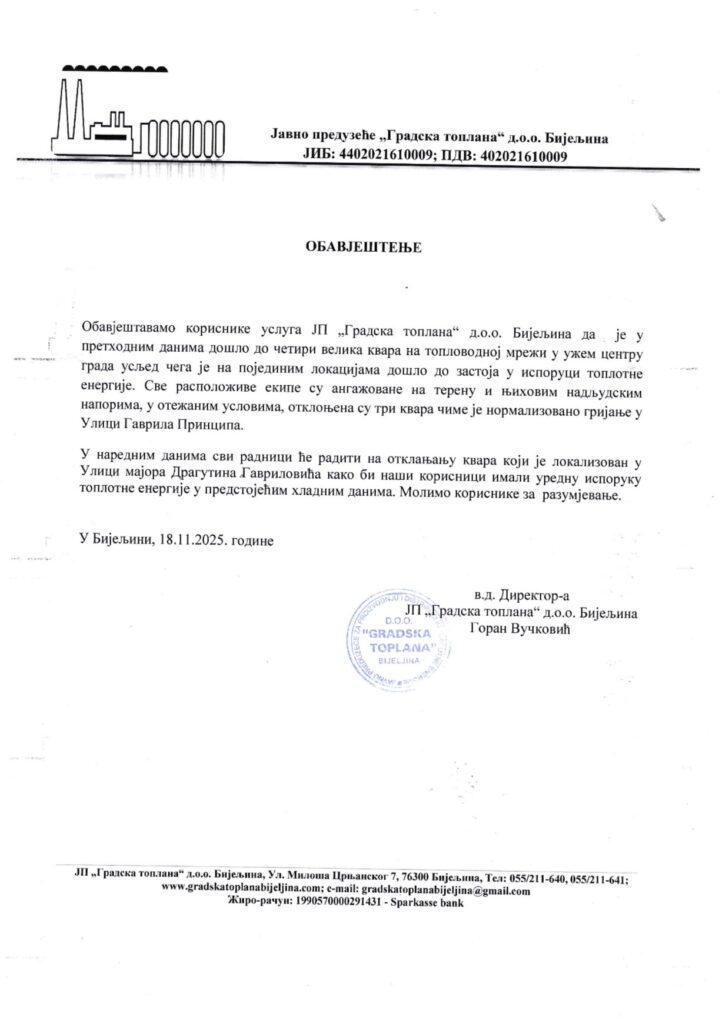 ”Obavještavamo korisnike usluga JP „Gradska toplana” d.o.o. Bijeljina da je u prethodnim danima došlo do četiri velika kvara na toplovodnoj mreži u užem centru grada usljed čega je na pojedinim lokacijama došlo do zastoja u isporuci toplotne