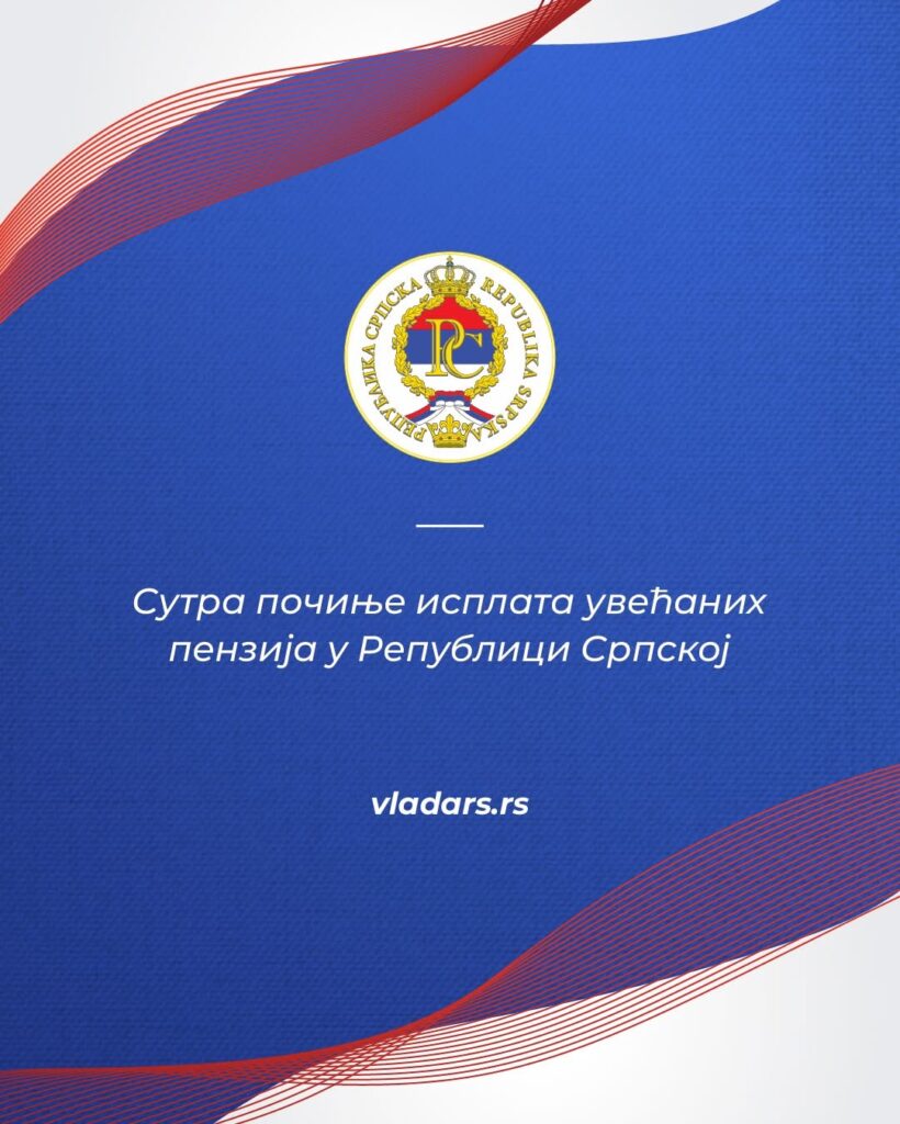 Ministarstvo finansija Republike Srpske isplatiće u petak, 06.02.2026. godine, ukupno 178.300.000 KM za januarske penzije koje su redovnim godišnjim usklađivanjem uvećane za 6,45% u odnosu na decembarsku penziju.