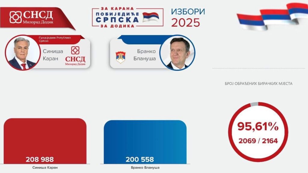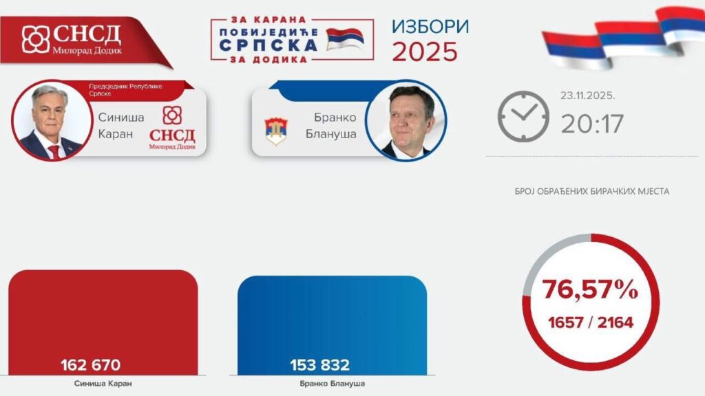 20:23h ŠTAB SNSD-a Banja Luka: Na 76,57% obrađenih biračkih mjesta Karan vodi za nekih 9.000 razlike u odnosu na Blanušu