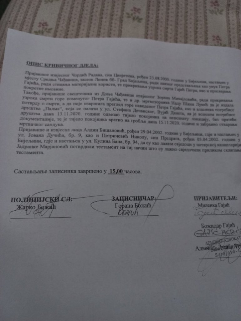 Inače, pokojnikova kćerka je dan ranije u bijeljinskoj policiji, sa stricem Božidarom Gajićem, podnela krivičnu prijavu protiv petoro ljudi, “zbog osnovane sumnje da su prikrivali uzrok smrti, lažno svedočili, lažno se predstavljali radi sticanja protivpravne koristi i otuđenja tuđih stvari”. Prijavom je obuhvaćena i mrtvozornica, zbog sumnje da je “zloupotrebila službeni položaj jer je izdala potvrdu o smrti, a da nije ni videla mrtvaca”. Da ga je videla, smatraju kćerka i pokojnikov brat, morala bi da obavesti policiju zbog činjenice u kakvom je stanju zatečen 13. novembra u kući.