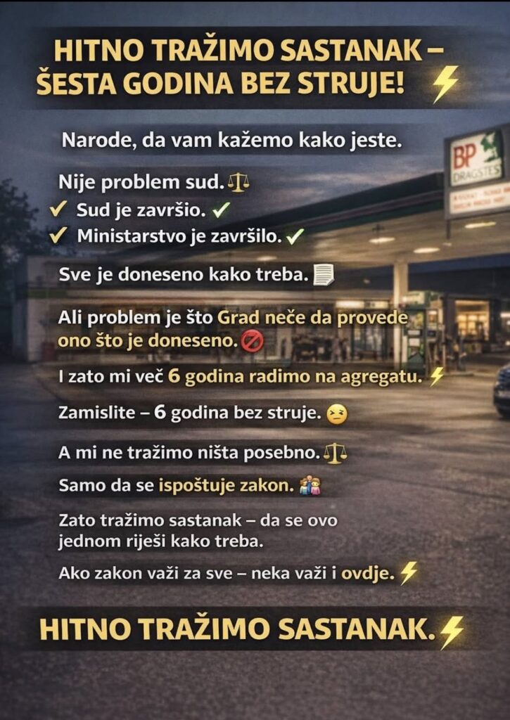 „Zamislite, šest godina bez struje. Radnici, porodice, posao, svi trpe. Ne tražimo ništa posebno, samo da se ispoštuje zakon“, naglasio je.