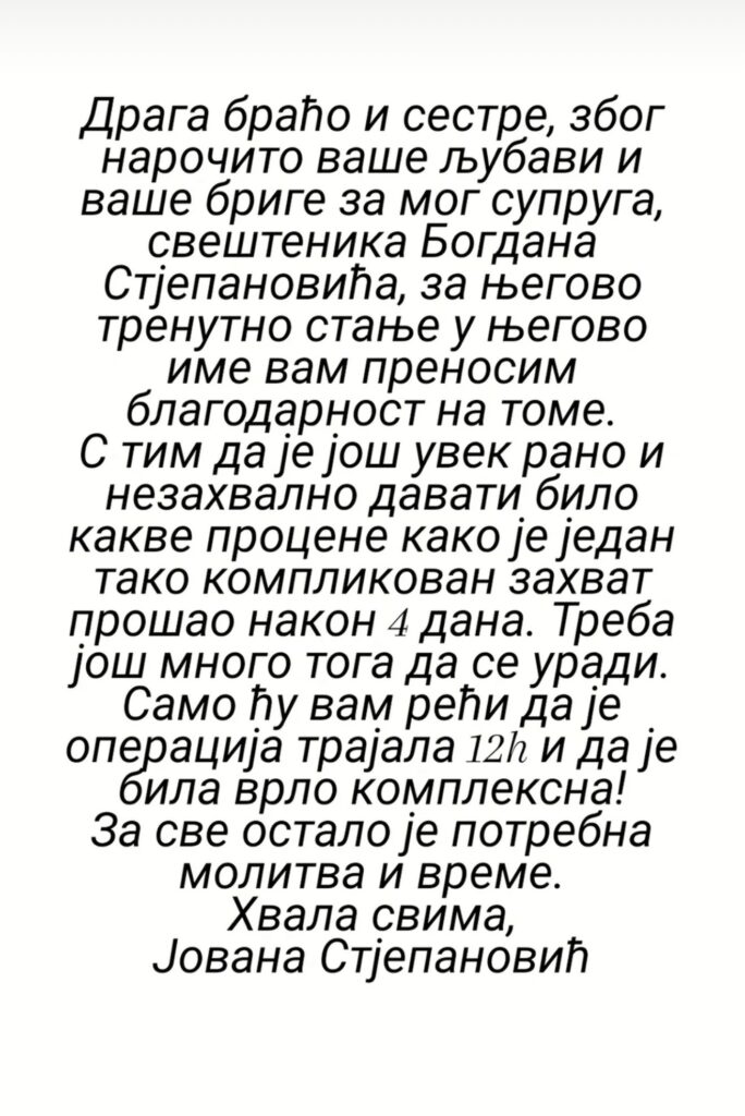 „Draga braćo i sestre, zbog naročito vaše ljubavi i brige za mog supruga, sveštenika Bogdana Stjepanovića, za njegovo trenutno stanje u njegovo ime vam prenosim zahvalnost“, poručila je Jovana.