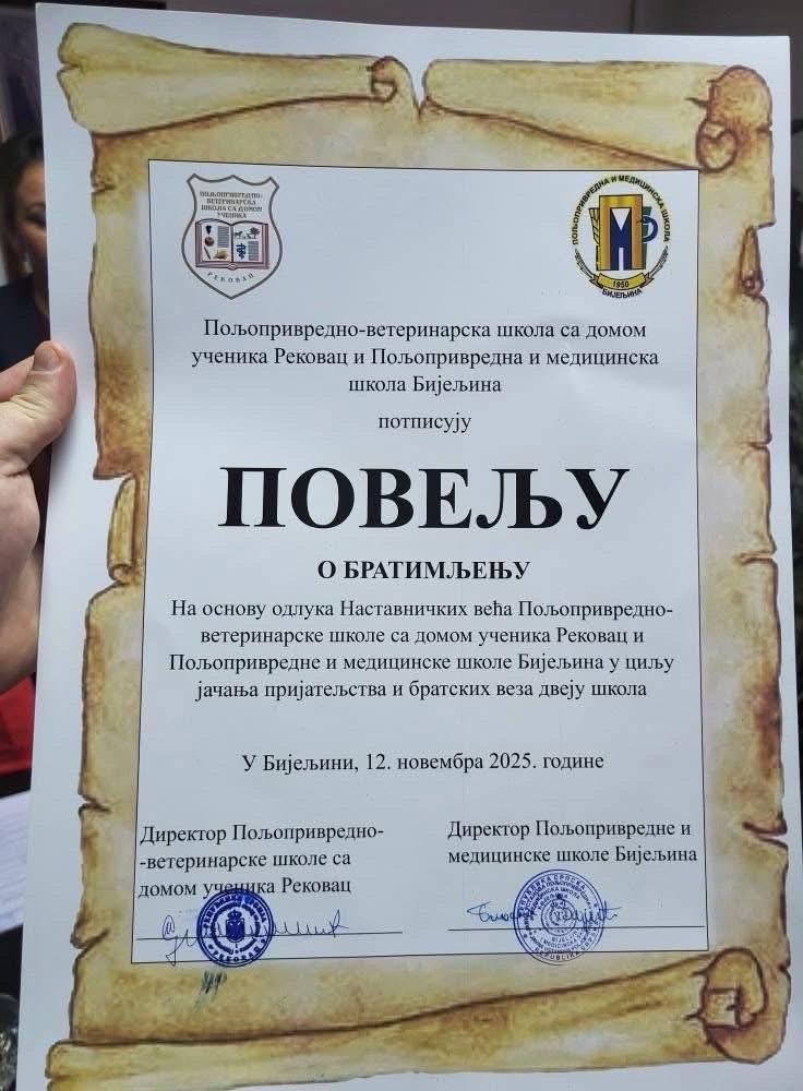 Dana 12.11.2025. godine, predstavnici JU Poljoprivredna i medicinska škola, Bijeljina i JU Poljoprivredno-veterinarska škola sa domom učenika Rekovac potpisali su Sporazum o saradnji i Povelju o bratimljenju.