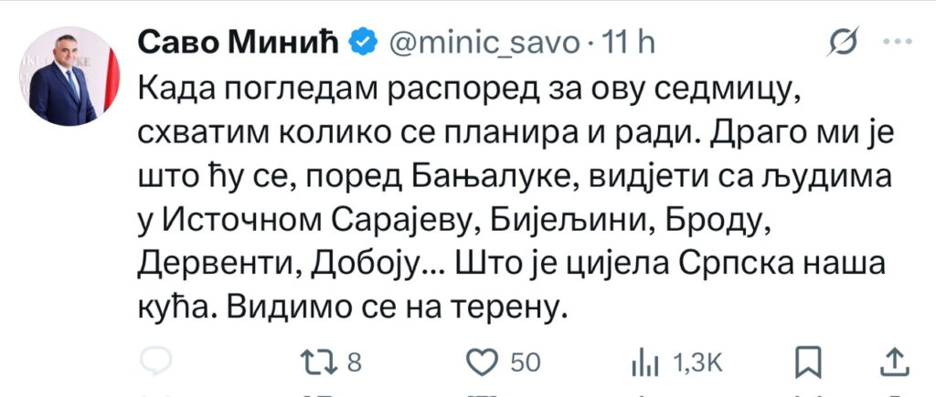 Predsjednik Vlade Republike Srpske Savo Minić na svom nalogu na mreži H objavio je planove za predstojeći period, ističući da će pored Banjaluke obići i Istočno Sarajevo, Bijeljinu, Brod, Derventu, Doboj i druge gradove.