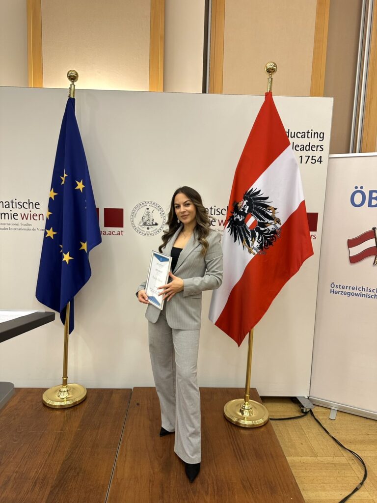 Posebno mi je zadovoljstvo istaći da sam dobitnik nagrade „Najbolji student u Austriji 2025. godine porijeklom iz Bosne i Hercegovine “, koju dodjeljuje Bosansko akademsko društvo u Austriji. Nagrada je uručena 3. oktobra na svečanoj ceremoniji u Diplomatskoj akademiji u Beču, a dodjeljuje se na osnovu najboljeg prosjeka ocjena tokom dosadašnjeg studiranja. Ova nagrada je potvrda mog dosadašnjeg rada i usavršavanja, ali i dokaz da se trud, posvećenost i upornost uvijek isplate.
