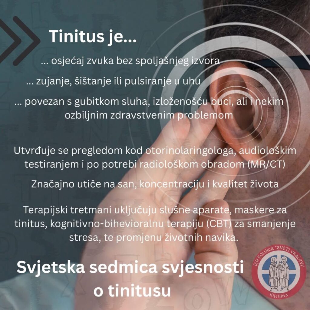 JZU Bolnica „Sveti Vračevi“ Bijeljina posjeduje najsavremeniju dijagnostičku opremu za ispitivanje tinitusa. U našoj ustanovi, pored specijalista otorinolaringologije, dijagnostikom ovih problema bave se i audiolog, kao i defektolog – surdoaudiolog. Izvodimo timpanometriju sa procjenom funkcije Eustahijeve tube, stapedijalne reflekse, audiometriju, kao i supraliminarne testove, a ukoliko se posumnja na dodatna oboljenja, pacijenti se upućuju na tercijarni nivo zdravstvene zaštite. Godišnje se u ORL ambulanti bijeljinske bolnice pregleda do 17.000 pacijenata. Od 20 do 30% ovih pacijenata su audiološki pacijenti, a gotovo svaki treći pacijent se žali na zujanje. Paradoksalno, imamo pacijente koji imaju senzorineuralni gubitak sluha, a nikada nemaju zujanje, dok drugi nemaju gubitak sluha, a imaju zujanje.