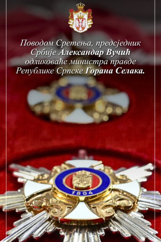 Ministar pravde Republike Srpske Goran Selak izjavio je Srni da je za njega velika čast da dobije Sretenjski orden prvog stepena i istakao da je to ujedno poruka vlastima Srpske da dobro štite nacionalne interese.