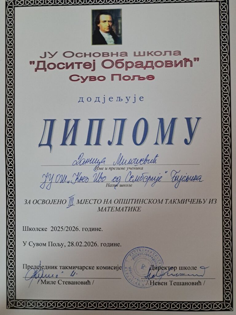 Posebno su se istakle učenice koje su još jednom potvrdile da se rad, trud i znanje uvijek isplate. Danica Milošević, učenica devetog razreda, osvojila je treće mjesto, dok je Nikolina Tešić, učenica osmog razreda, zauzela odlično četvrto mjesto. Ovi rezultati predstavljaju veliki ponos za školu i snažan podstrek za dalji rad.