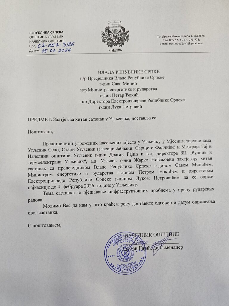 Kako je navedeno u zahtjevu, sastanak bi trebalo da se održi najkasnije do 4. februara 2026. godine u Ugljeviku, a tema razgovora bilo bi rješavanje infrastrukturnih problema nastalih usljed širenja površinskog kopa Rudnika Ugljevik.