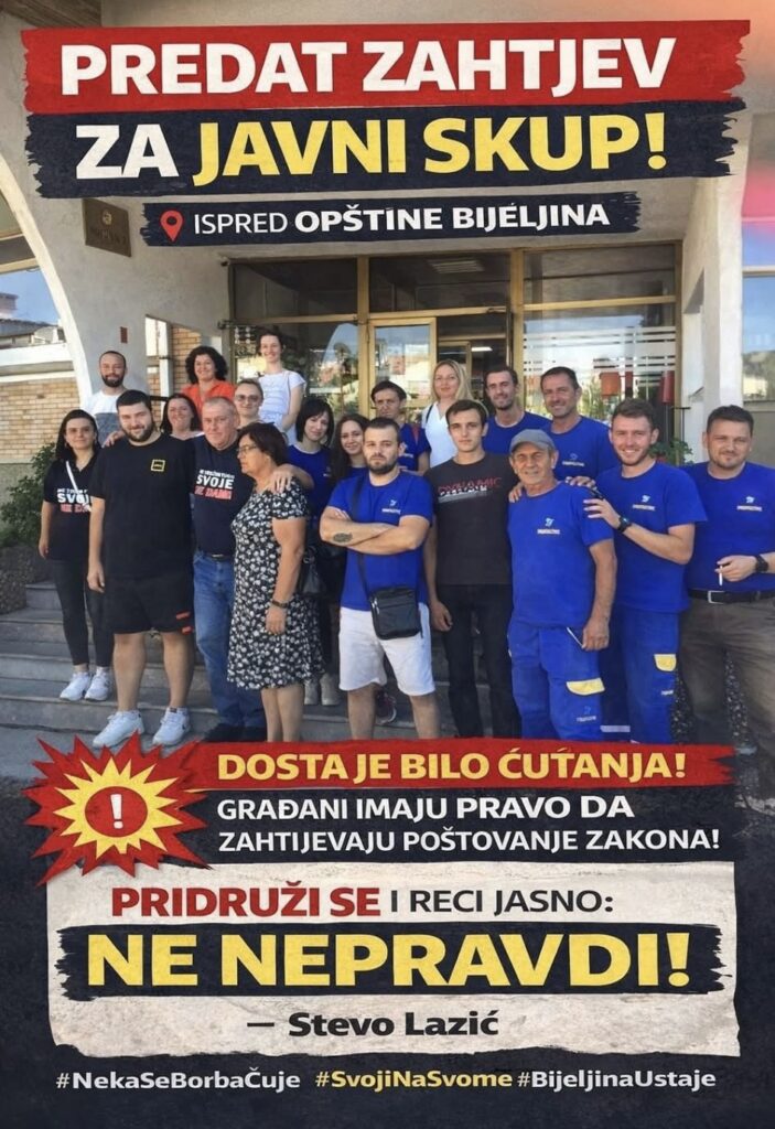 Za 24. februar 2026. godine, u periodu od 13.00 do 15.00 časova, zakazano je javno okupljanje ispred zgrade Opštine Bijeljina, nakon što je organizator Stevo Lazić nadležnim organima predao zahtjev za održavanje skupa.