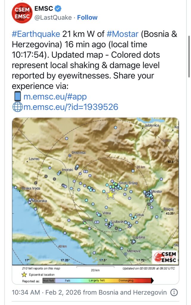 Prema podacima Evropsko-mediteranskog seizmološkog centra (EMSC), epicentar potresa bio je oko jedan kilometar od Širokog Brijega, na dubini od 10 kilometara.