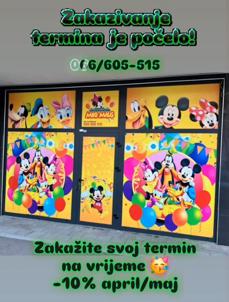 Priredite svojim malisanima nezaboravnu zurku u rodjendaonici Miki Maus. Zakazite zeljeni termin na vrijeme. Sa radom krecemo 24.04.2026.g. Radujemo se druzenju. Info:066/605-515 Kontakt telefon: 066605515